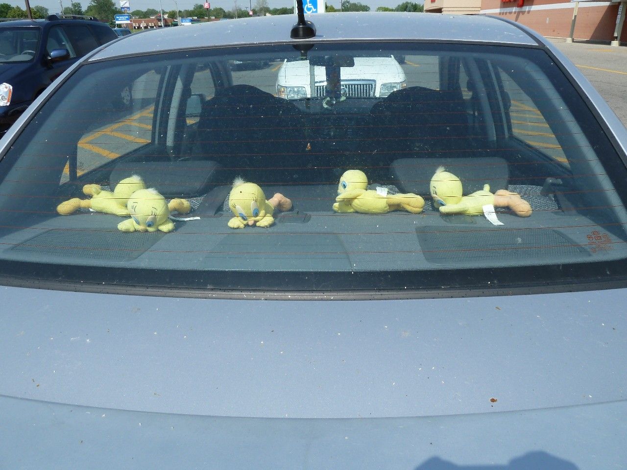 Heh, fooled ya! Poor little stuffed Tweetys… but seriously, never leave pets in a car!