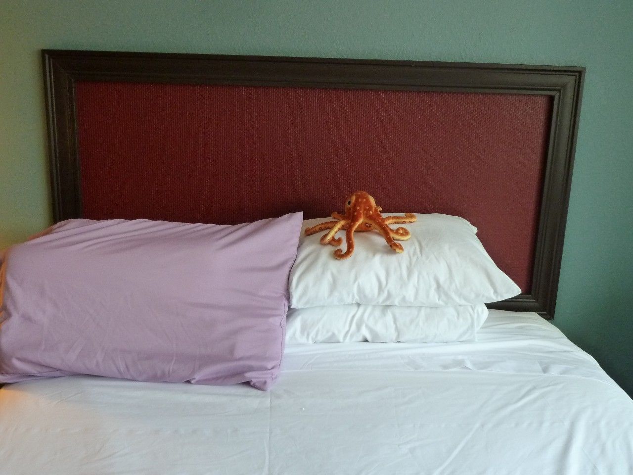 Who needs a mint on pillow when you can get an octopus? Cute! Forgot I’d left the stuffed cephalopod on the bed.